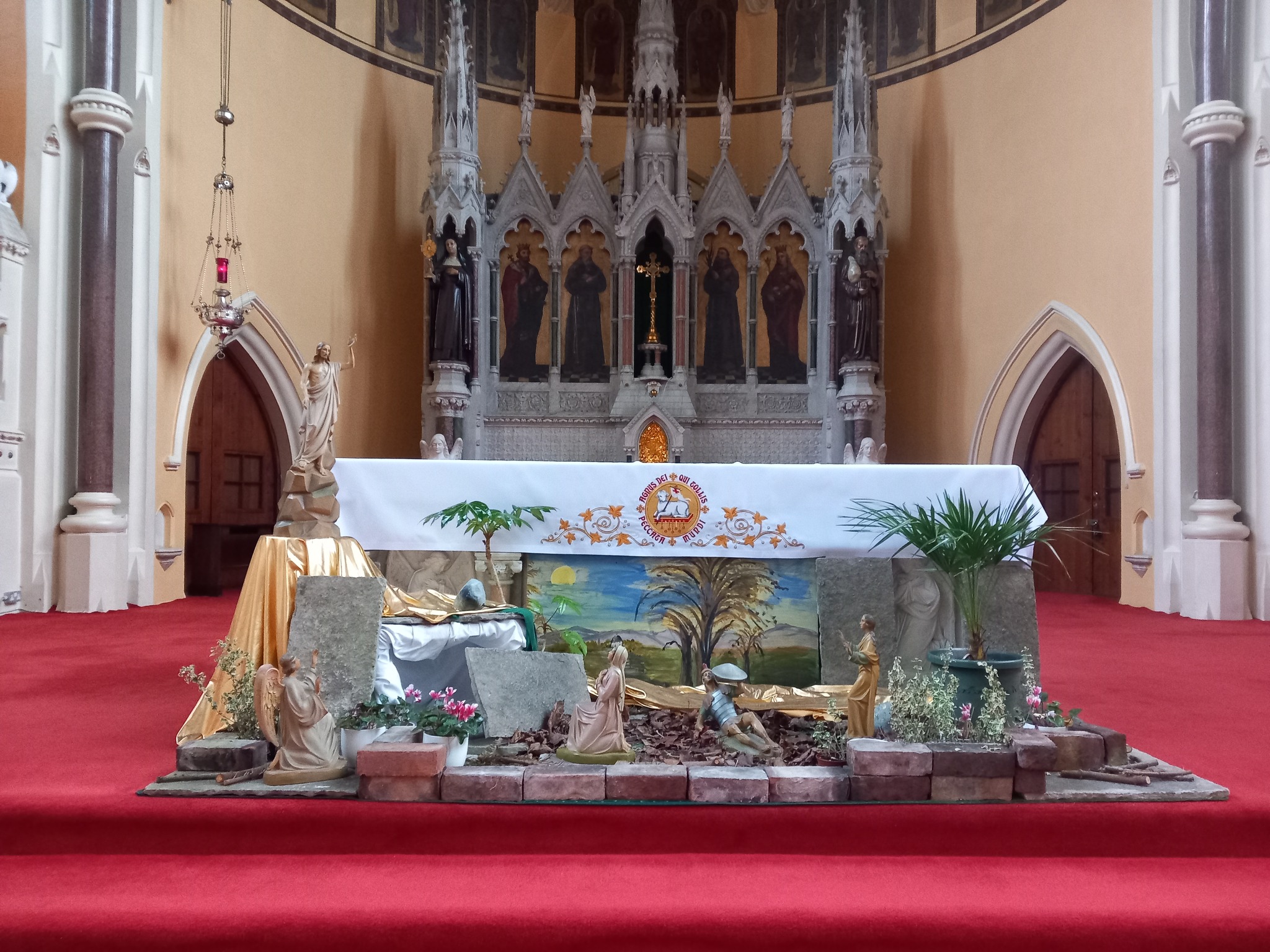O altar-mor e o retábulo são de James Pearse (1839-1900), pai do líder de 1916, Patrick Pearse. O retábulo retrata seis santos franciscanos: Santa Clara, com um ostensório, São Luís da França, São Lourenço de Brindisi, São Fidelis de Sigmaringen, Santa Isabel da Hungria e São Félix de Cantalice.